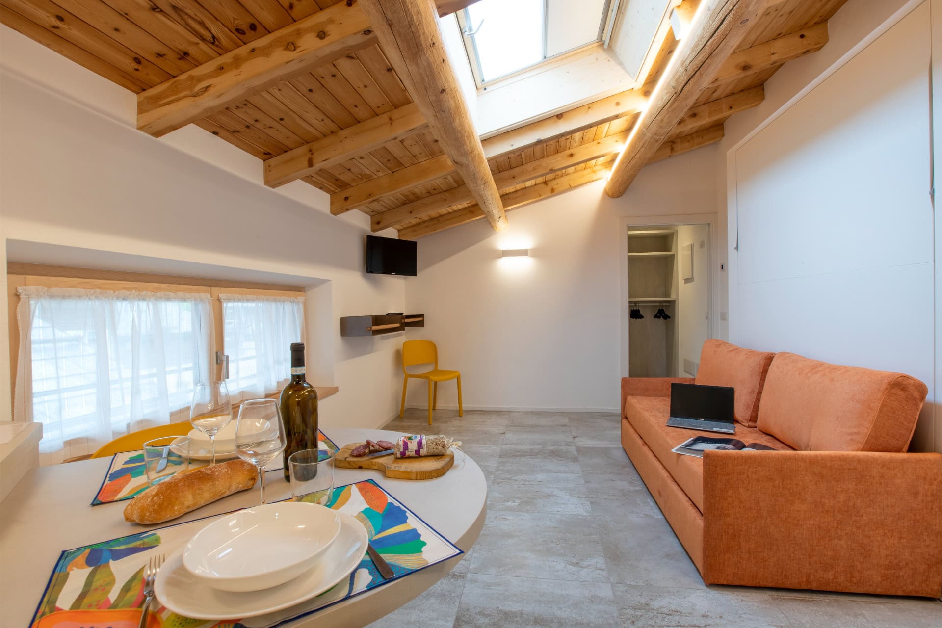 Di giorno la luce naturale esalta gli spazi del loft, che si apre su una cucina attrezzata con pentole e stoviglie, piano a induzione, frigorifero con cella freezer, microonde, lavastoviglie, bollitore e macchina da caffè espresso. Ogni dettaglio è pensato per offrire comfort e libertà.