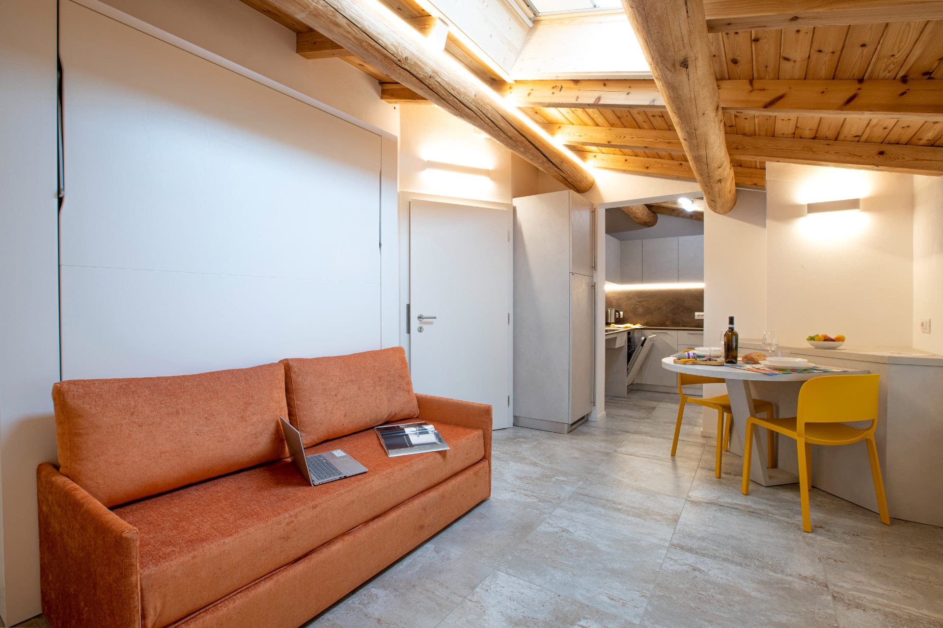 Di sera il pratico letto a scomparsa trasforma la zona living in una camera da letto accogliente.