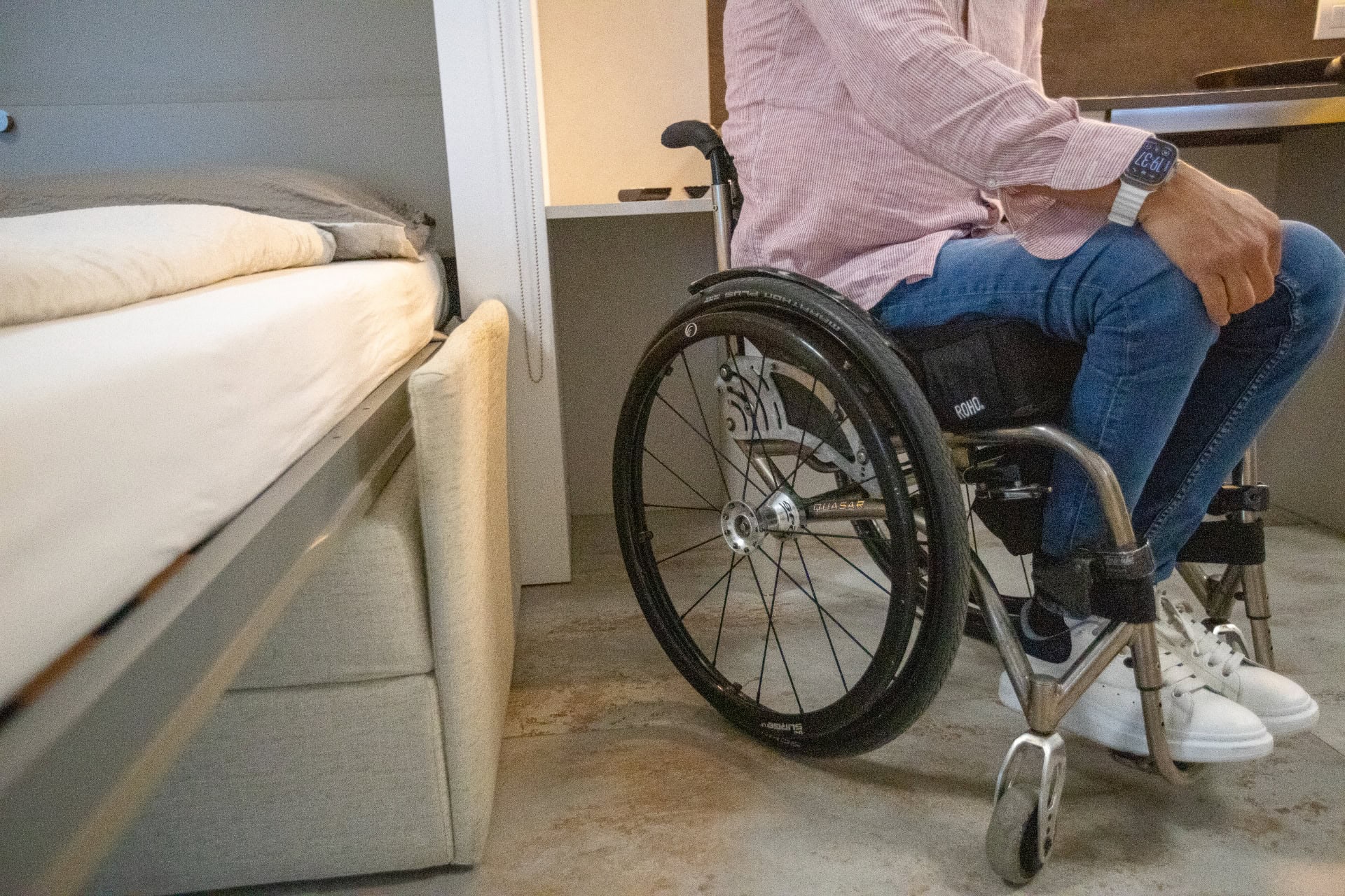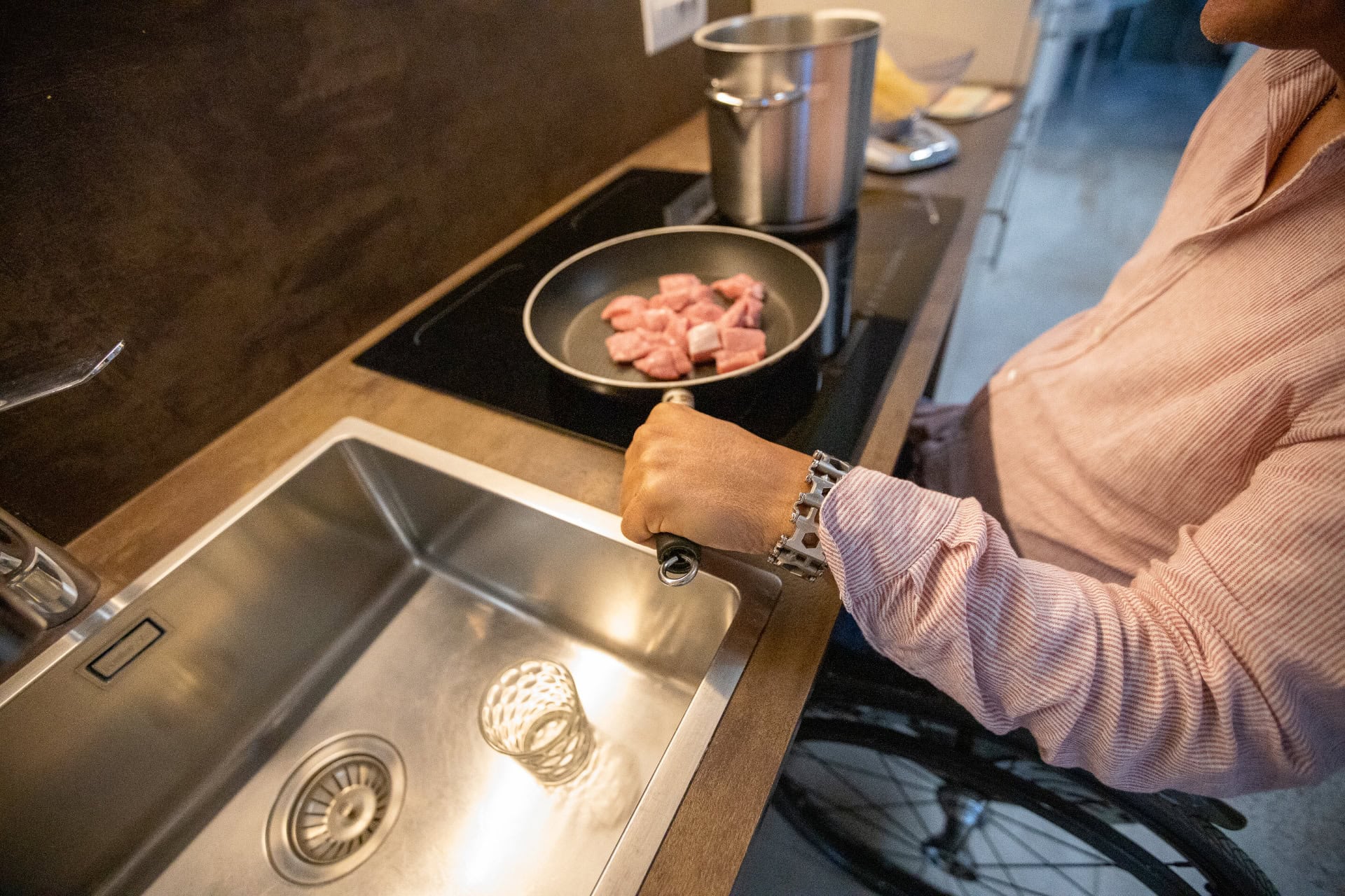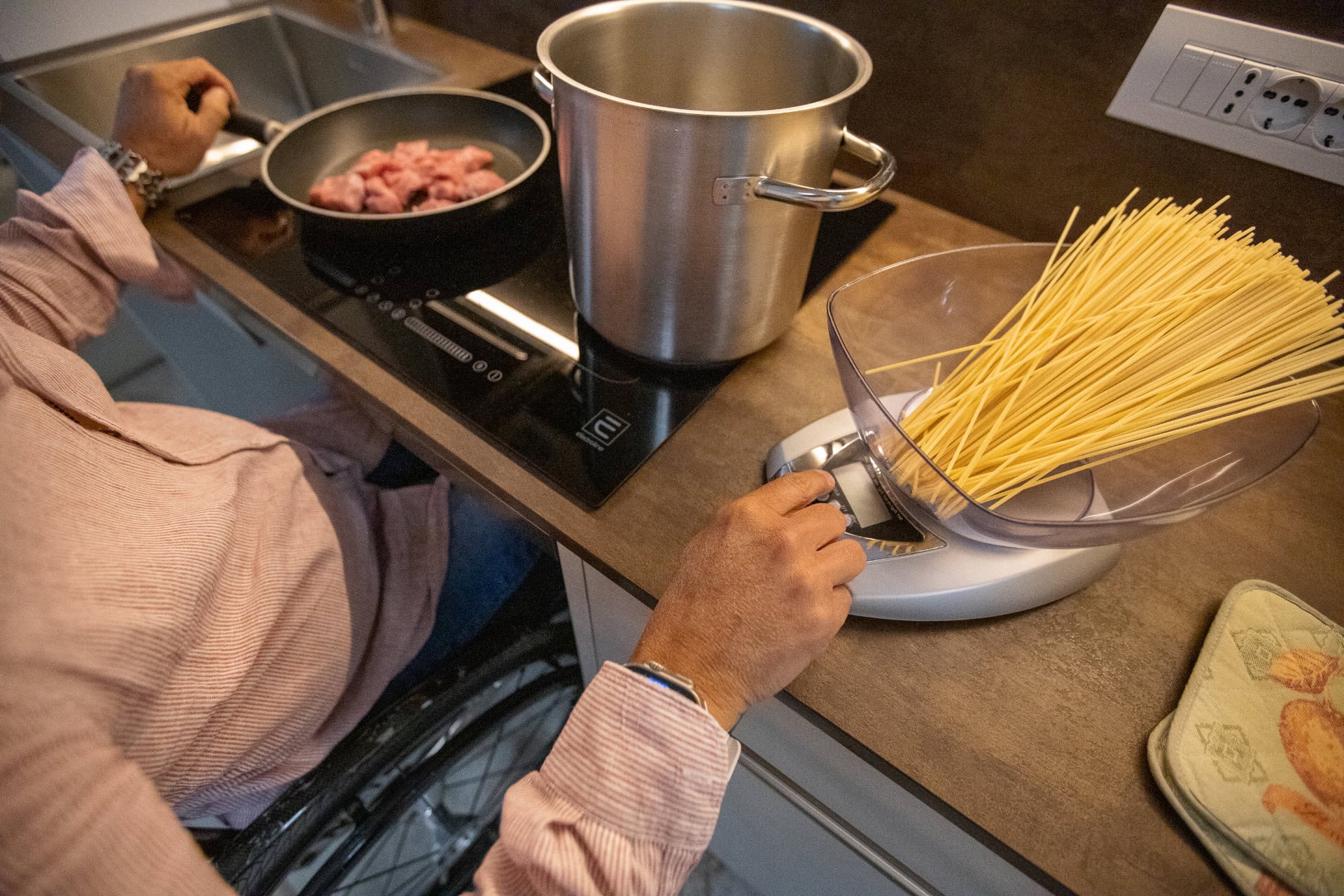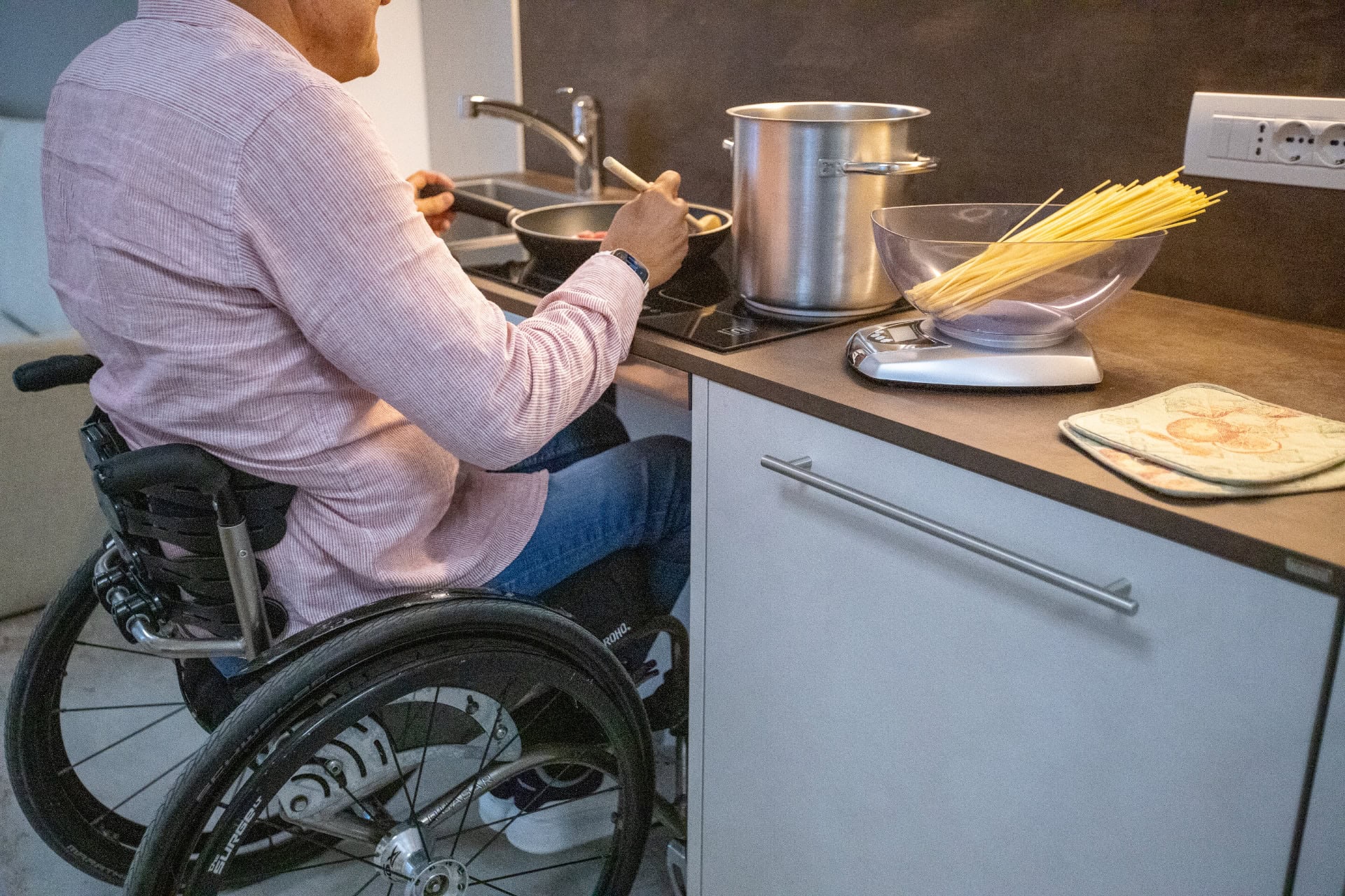 La cucina è un vero esempio di design accessibile: lavandino con doccetta estraibile, piani di lavoro sospesi e spazi studiati per essere facilmente fruibili anche da chi utilizza la sedia a rotelle.